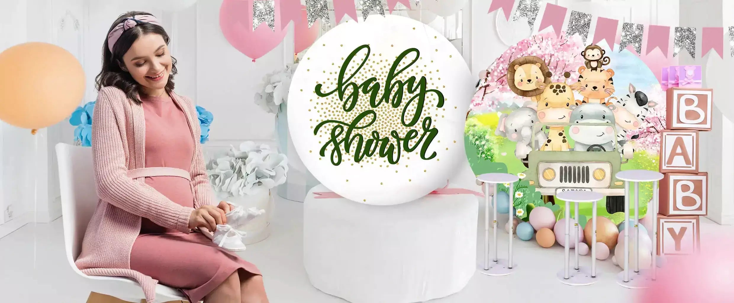 Oh Baby Cute Jungle Animal Circle Backdrop – Safari Jeep Baby Shower Background