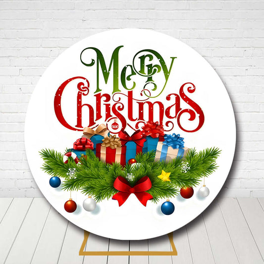 Merry Christmas Circle Backdrop – Festive Gifts and Pine Ornaments
