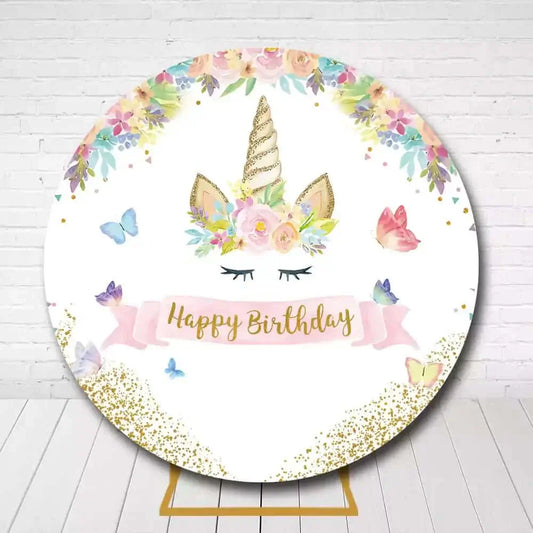 Magical Unicorn Circle Backdrop – Flower and Butterfly Happy Birthday Design