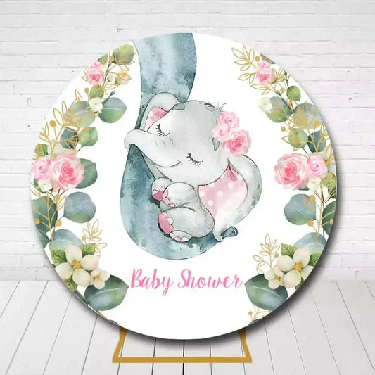 Pink Flowers and Greenery Cute Elephant Baby Shower Circle Backdrop