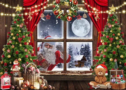 Santa Claus Christmas Window Scene Photography Backdrop with Tree & Gift Decorations