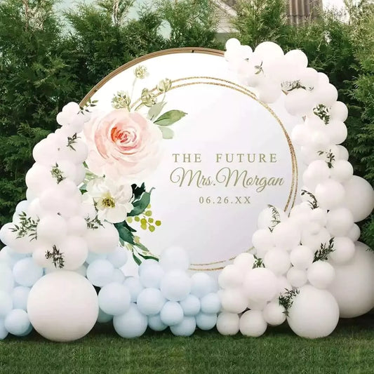 Future Mrs. Floral Backdrop – Blush Pink Roses & Gold Circle Design