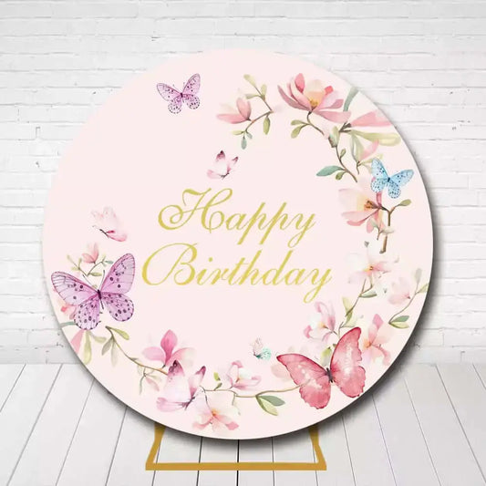 Butterfly and Floral Birthday Round Backdrop – Soft Pink with Golden "Happy Birthday"