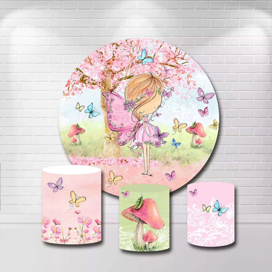Fairy Butterfly Theme Round Backdrop Cover Pink Flowers Princess Girl Birthday Background Table Banner Plinth Covers XQ2017
