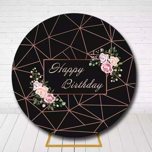 Black Geometric Round Backdrop – Happy Birthday with Rose Flowers