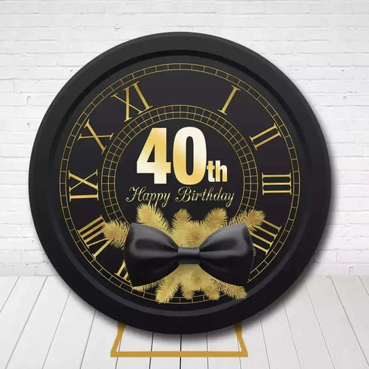 40th Birthday Round Backdrop – Black Gold Clock and Bow Tie Design