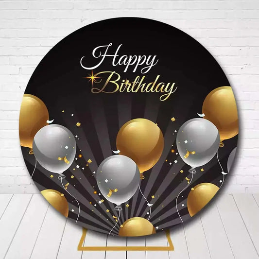 Black and Gold Happy Birthday Circle Backdrop with Gold and Silver Balloons