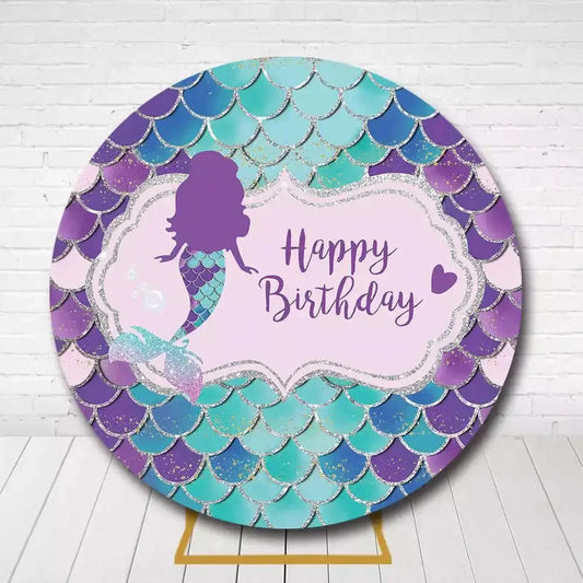 Under the Sea Mermaid Birthday Round Backdrop – Glittery Scales and Mermaid Silhouette